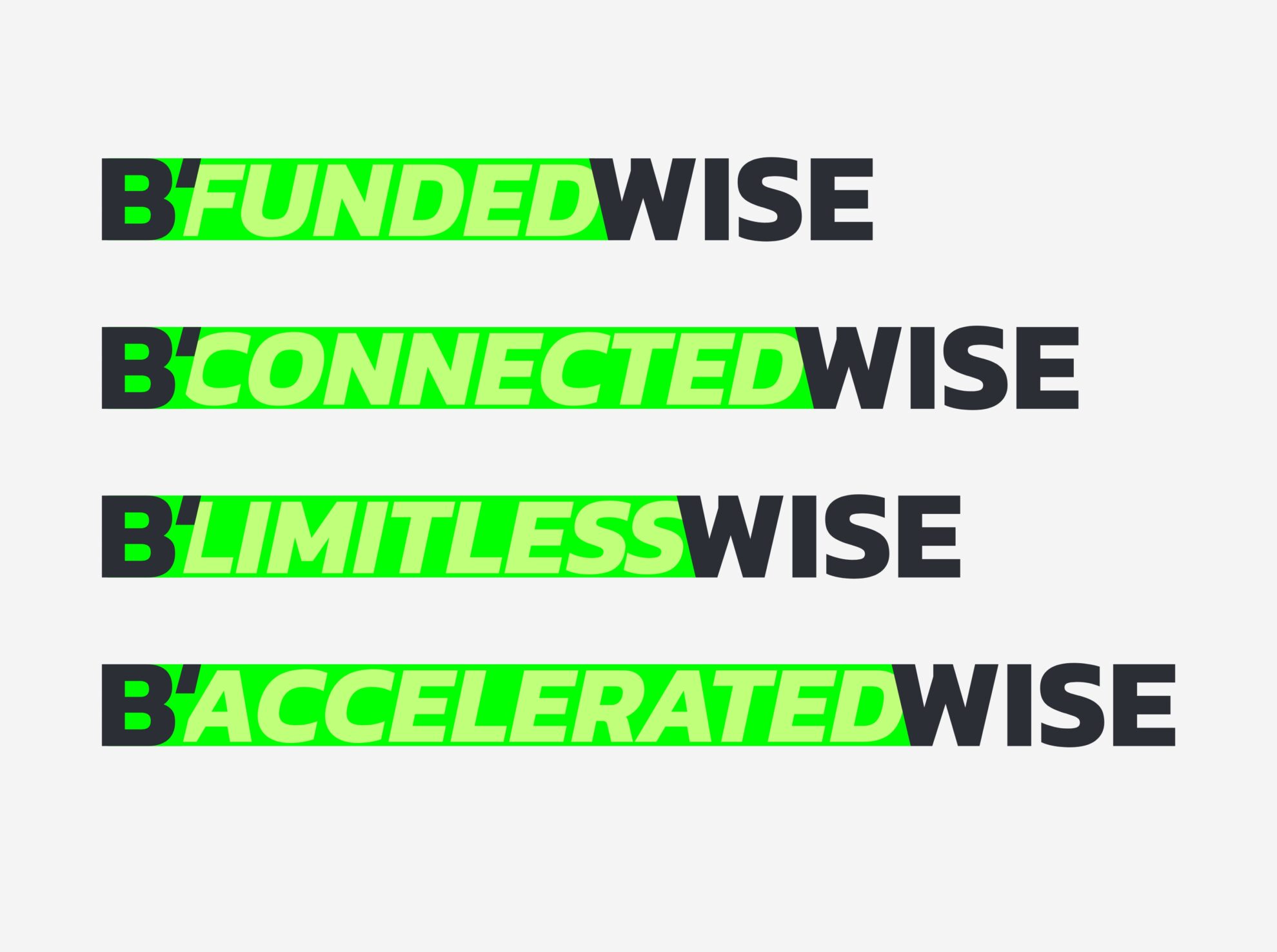 B’Wise ondersteunt startups en doet dat op verschillende gebieden. Omdat het aanbod erg breed is hebben wij een visuele identiteit ontwikkeld waarbij die verschillende gebieden een eigen plek krijgen.