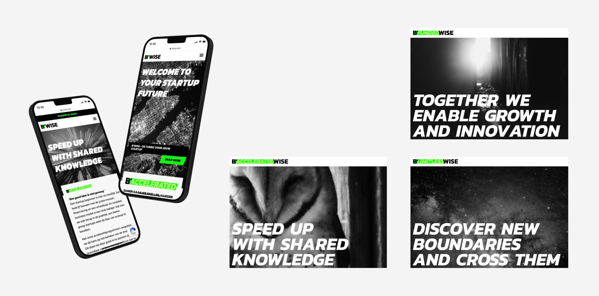 Om op te vallen tussen alle startup ondersteuners is de visuele identiteit extra krachtig. Het stoere en robuuste karakter van B’Wise uit zich in vette typografie in combinatie met gifgroene vlakken en fotografie in zwartwit met hoog contrast. Door deze combinatie ontstaat er een uniek en herkenbaar beeld. Één ding is zeker: je kan niet om B’Wise heen.